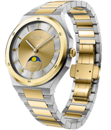 - 41mm x 47.5mm encased in brushed steel and polished gold